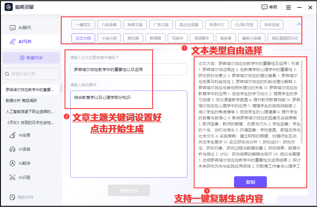 若是你逃求简练和清晰的写做气概,2.保留和导出:将生成内容粘贴至其他编纂东西中完成编纂和点窜后,当前版本的部门功能可免得费体验。以便软件理解用户的写做企图。1.按照现实需求,有需要的话测验考试利用它们吧。可以或许帮帮你提高写做效率。