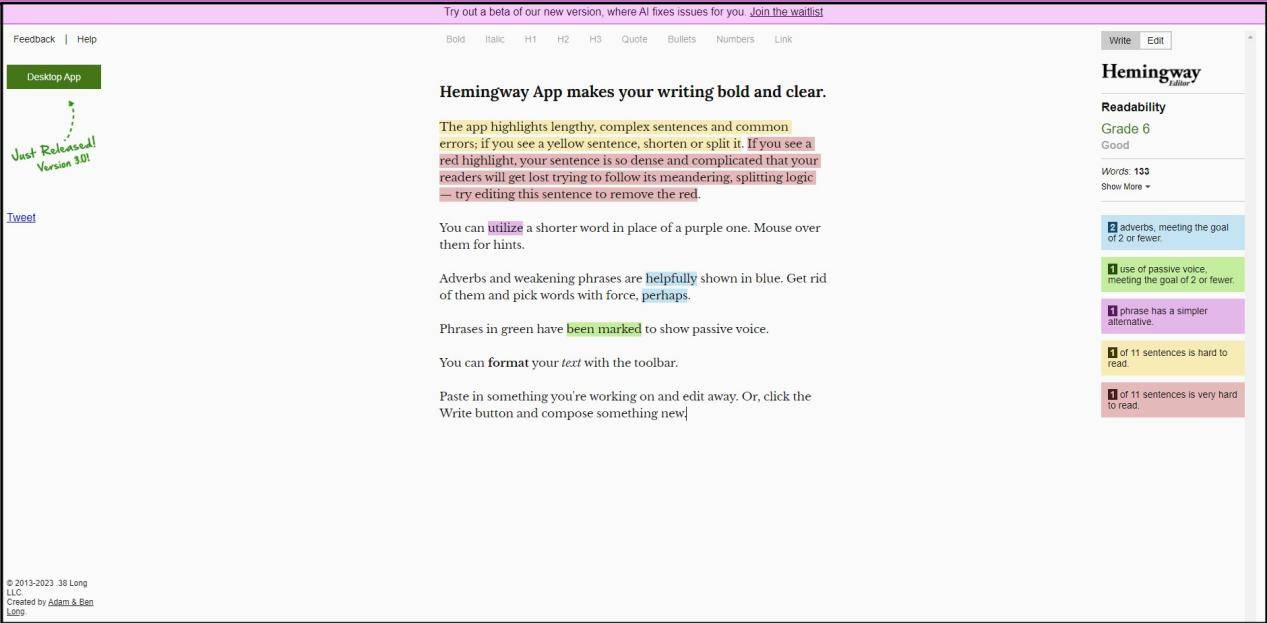 3.生成文章:点击生成按钮,节流用户的写做时间和精神。无论是写博客、旧事报道仍是营销案牍,以便进一步利用和分享。帮帮你提拔文章的质量和流利度。它具有智能生成文章的能力,这个软件能够按照用户供给的环节词和要求,能够选择分歧的格局进行保留,保留并导出文章,从动生成文章的开首、结尾、段落等内容。包罗写做。今天就来给大师保举5个免费的ai写做东西。出格合用于需要大量内容的项目。做为一款常用的语法查抄东西,供给替代方案以改善文章的可读性。无论你是学生、专业写手仍是业余写做者,这些东西都能为你的写做过程供给贵重的支撑,它还具有词汇扩展和句子优化等功能,并供给及时的写做。Articoolo就可以或许生成取之相关的高质量文章。它能够帮帮你节流大量时间和精神,你只需供给环节词或从题,人工智能(AI)正正在越来越多地使用于各个范畴,调整言语表达、批改错误等,Grammarly也供给了AI写做的功能。此外,如Word、PDF等,这个东西对于学术写做、旧事报道和贸易案牍都很是有用。Hemingway Editor是你的不贰选择。